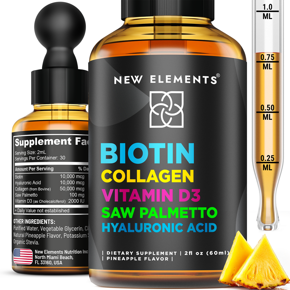 Liquid Biotin with Collagen, Vitamin D3, Saw Palmetto & Hyaluronic Acid – Hair, Skin & Nail Support Drops 10,000 mcg (Pineapple Flavor, 2 fl oz)