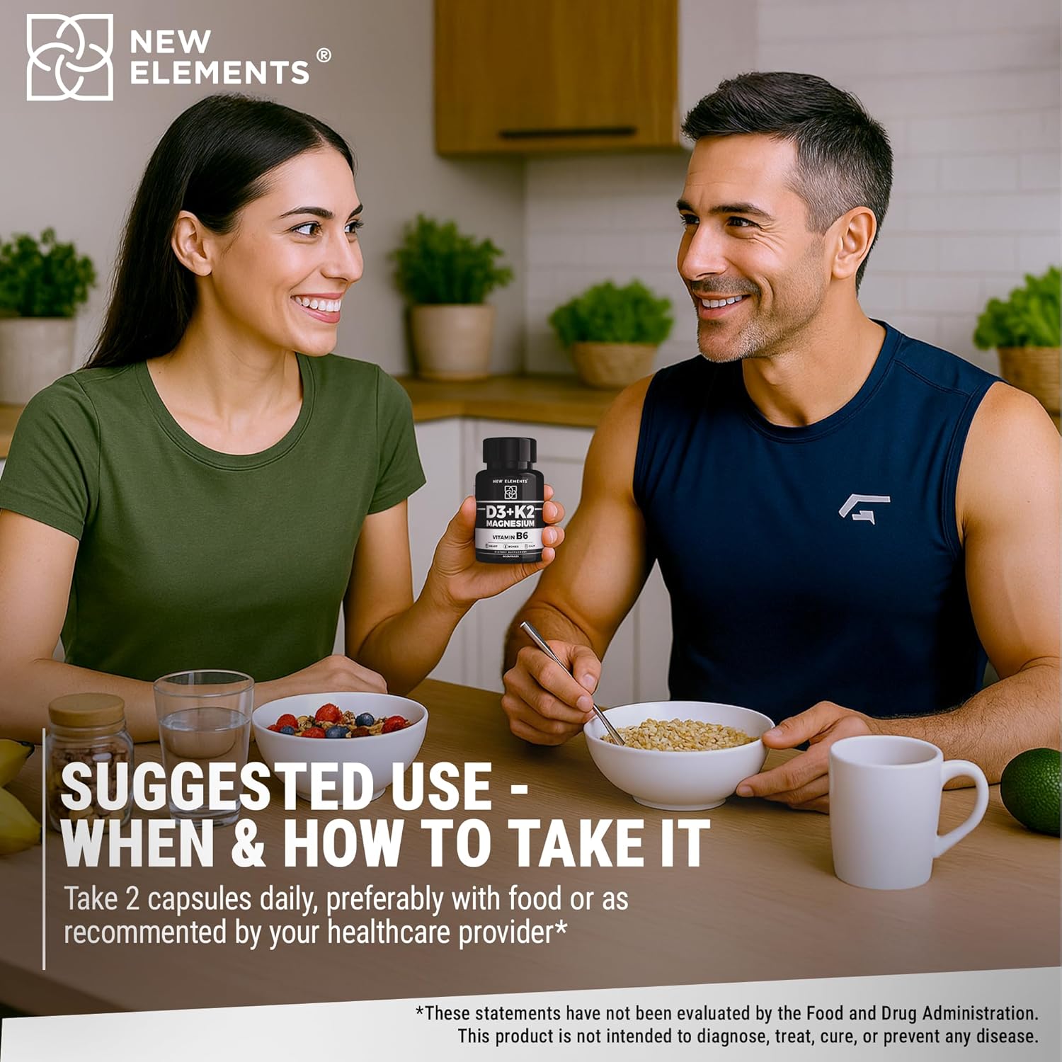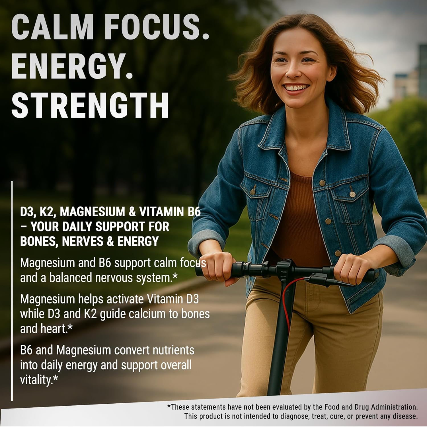 Vitamin D3 K2 with Magnesium Glycinate & B6 β Bone, Heart & Immunity Support β 60 Vegan Capsules β High Absorption, Non-GMO